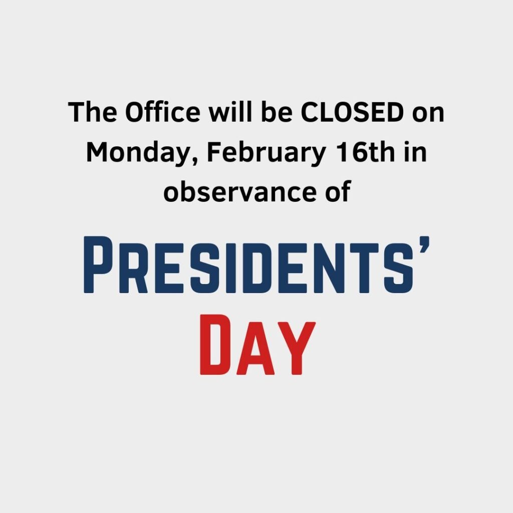 The office is closed on Monday, February 16th in observance of Presidents Day.