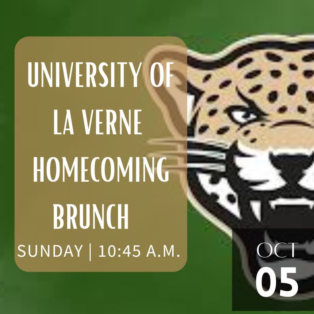 Join us for the University of La Verne’s Homecoming Brunch hosted at the La Verne Church of the Brethren! It’s a perfect opportunity to come together, celebrate, and nourish both our minds and bodies. Everybody is welcome! Whether you’re a ULV alum or not! Bring your friends, family, and community spirit to this joyful gathering.