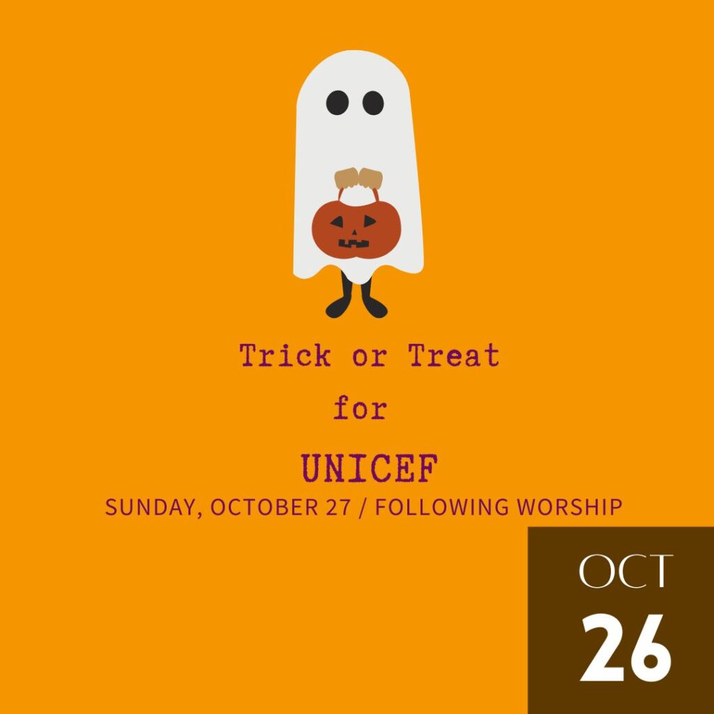 Come to church dressed up (anyone who wants to dress up) in your Halloween costume and collect donations for UNICEF, an organization that works to save and protect children around the world.
